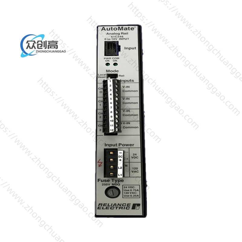 模拟输入模块有8个通道,以8位分辨率工作。的电压范围为0至10 VDC,其输入抗为100千欧。电流消耗的平均额定值取RELIANCE 0-60021-4决于您观察的通道。第一个通道的平均额定功耗为25 mA,第二个通道的平均额定功耗为0 mA,第二个通道的平均额定功耗为60 mA。转换时间仅为1毫秒。隔离没有与DC输入分开,也没有提供输入之间的隔离。除了所有这些规格外,还获得了UL认证。