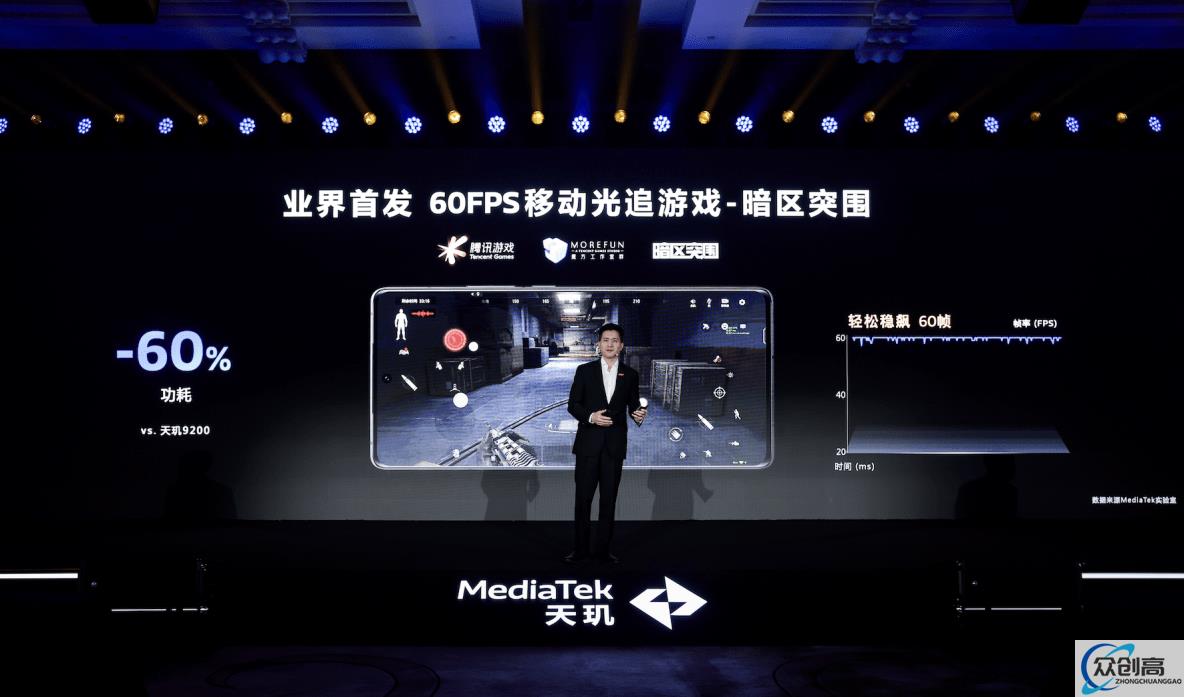 得益于领跑级的光追性能,天玑9300在业界首发支持《暗区突围》60FPS光线追踪,不仅轻松稳定60帧且十分稳定,功耗也显著降低60%,能为用户带来更加逼真的超流畅移动光追体验。