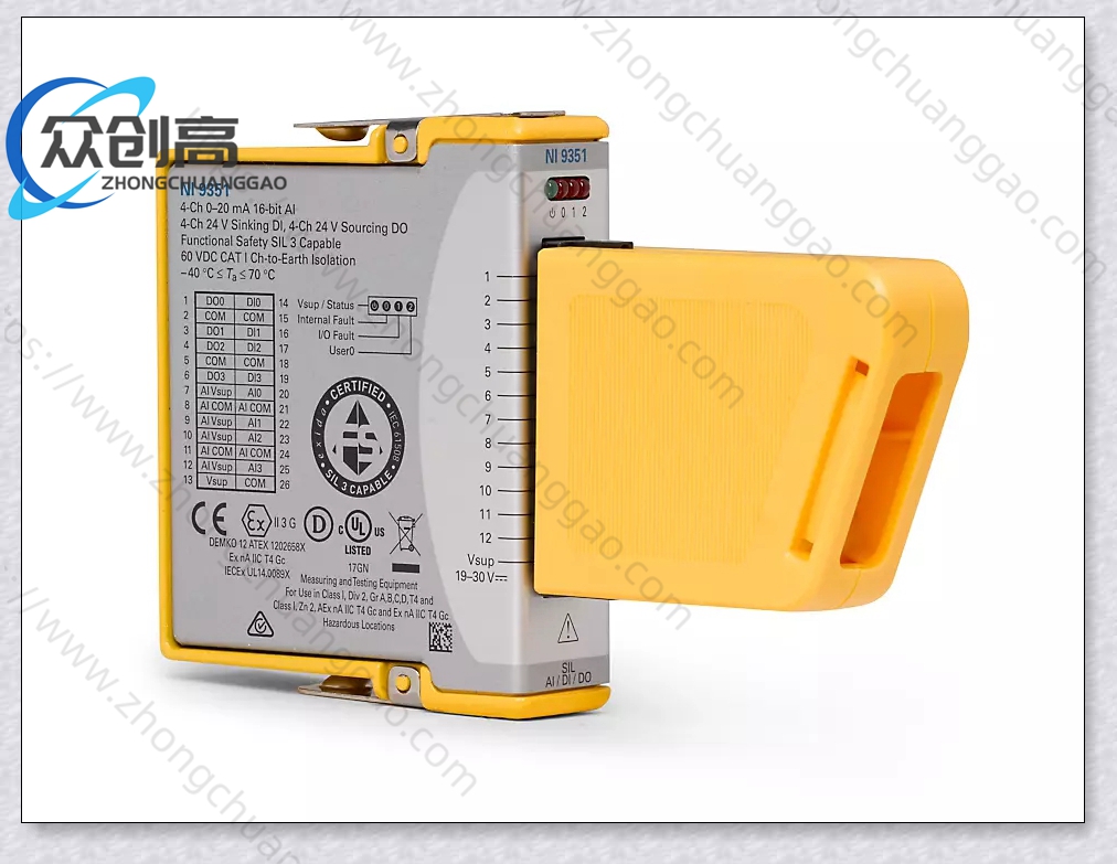 C系列功能安全模块提供了基于IEC 6I508的SIL 3认证。安全逻辑解算器位于模块内,您可以使用附带的功能安全编辑器软件对其进行编程。NI-9351C系列功能安全模块该模块包含内置诊断程序,可以监测硬件的状态以及连接的完整性。NI-9351C系列功能安全模块这些模块适用于制造组件和测试单元、大型物理测试、状态监测应用和过程监测和控制等应用的重要安全功能控制。